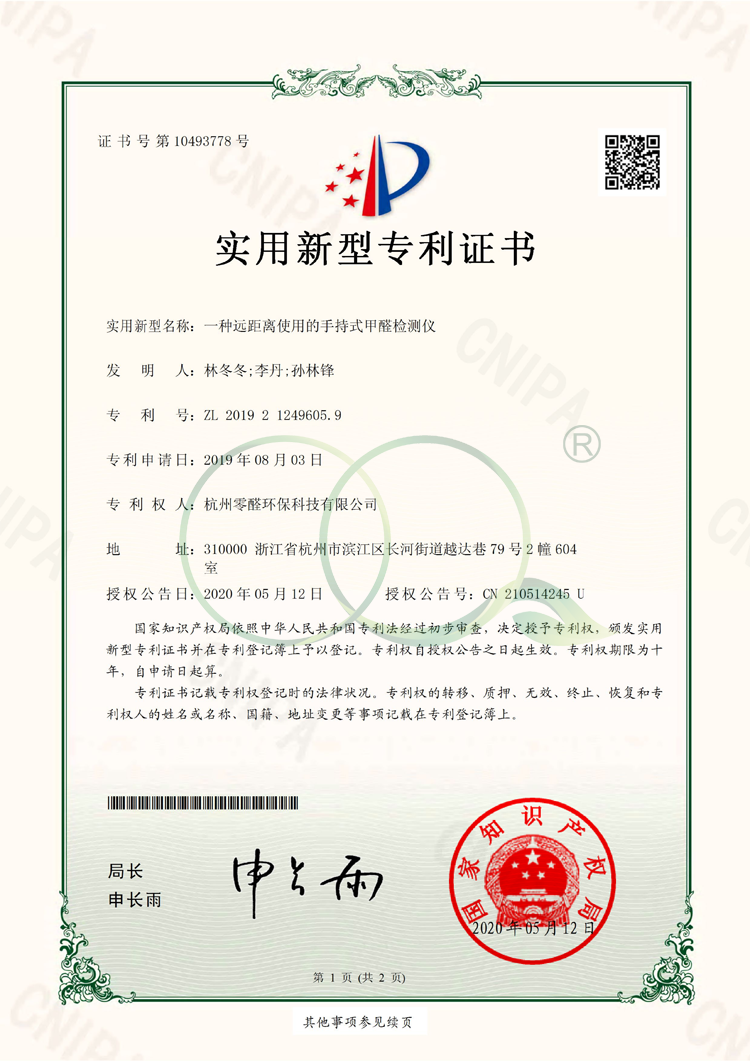 專利證書:一種遠(yuǎn)距離使用的手持式甲醛檢測儀