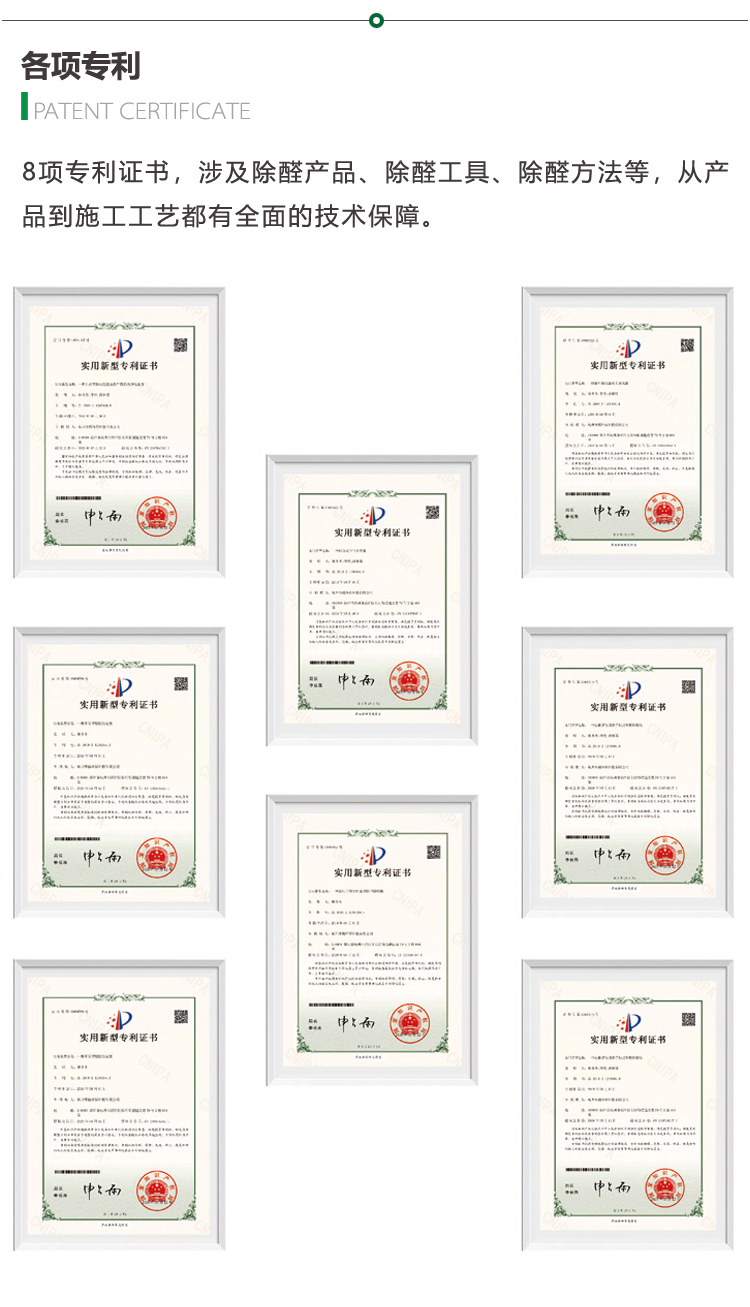 2020年5月,杭州零醛環保科技有限公司技術研發反面又獲得重大突破,共獲得8項專利,專利設計除醛設備、除醛工具、除醛方法等各個方面。技術的提升旨在為客戶提供更加專業和可靠的除醛服務。
